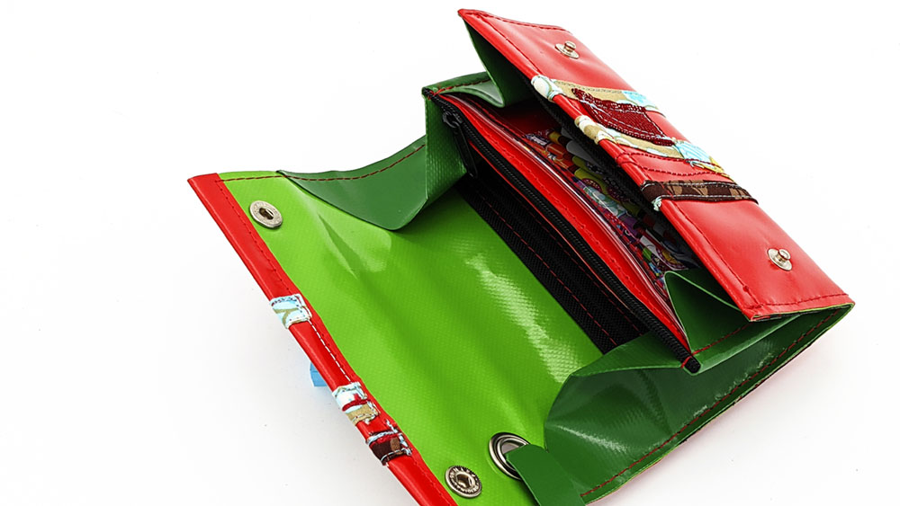 Der Moneywear Geldbeutel besteht aus strapazierfähiger Plane und Cordura, die nicht nur wasserfest sind, sondern auch griffbeständig. Das einzigartige Design des Geldbeutels wird durch die Bestickung mit Designer Baumwollstoffen unterstrichen. Die Maße des Geldbeutels betragen ca. 16 cm in der Breite, 9 cm in der Höhe und 3 cm in der Tiefe, wenn er geschlossen ist.